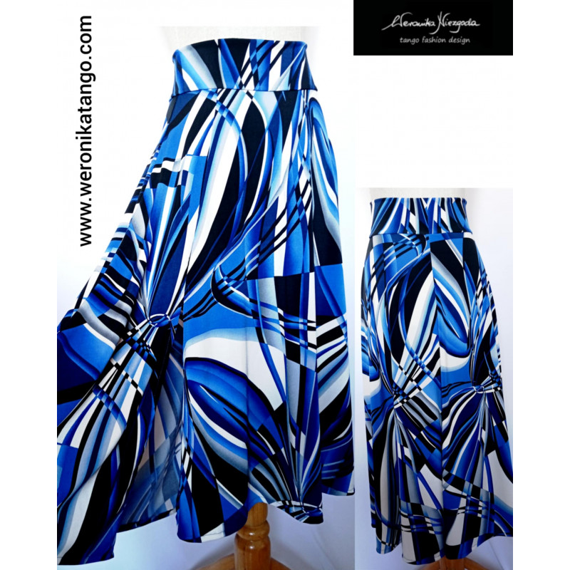 Amelia - Spódnica szeroka, tańczącą z wydłużonym tyłem oraz rozporkiem na prawej nodze z przodu oraz z tyłu. Przepiękna dzianina w duży abstrakcyjny wzór w odcieniach kobaltu, granatu i kremu.