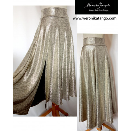 Amelia - Spódnica szeroka, tańczącą z wydłużonym tyłem oraz rozporkiem na prawej nodze z przodu oraz z tyłu. Przepiękna dzianina w jasnym złocie. To nie jest brokat ale mieni się niezwykle elegancko.